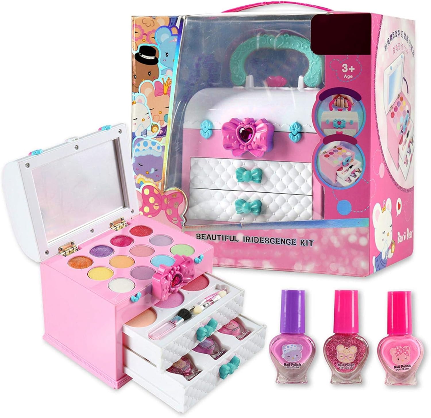 子どもの安全性を考えてつくられたメイクセット。水溶性なので落としやすく、いつでも気軽にメイクを楽しめます。まるでジュエリーボックスのような三段のネイルボックスがおしゃれですね。
