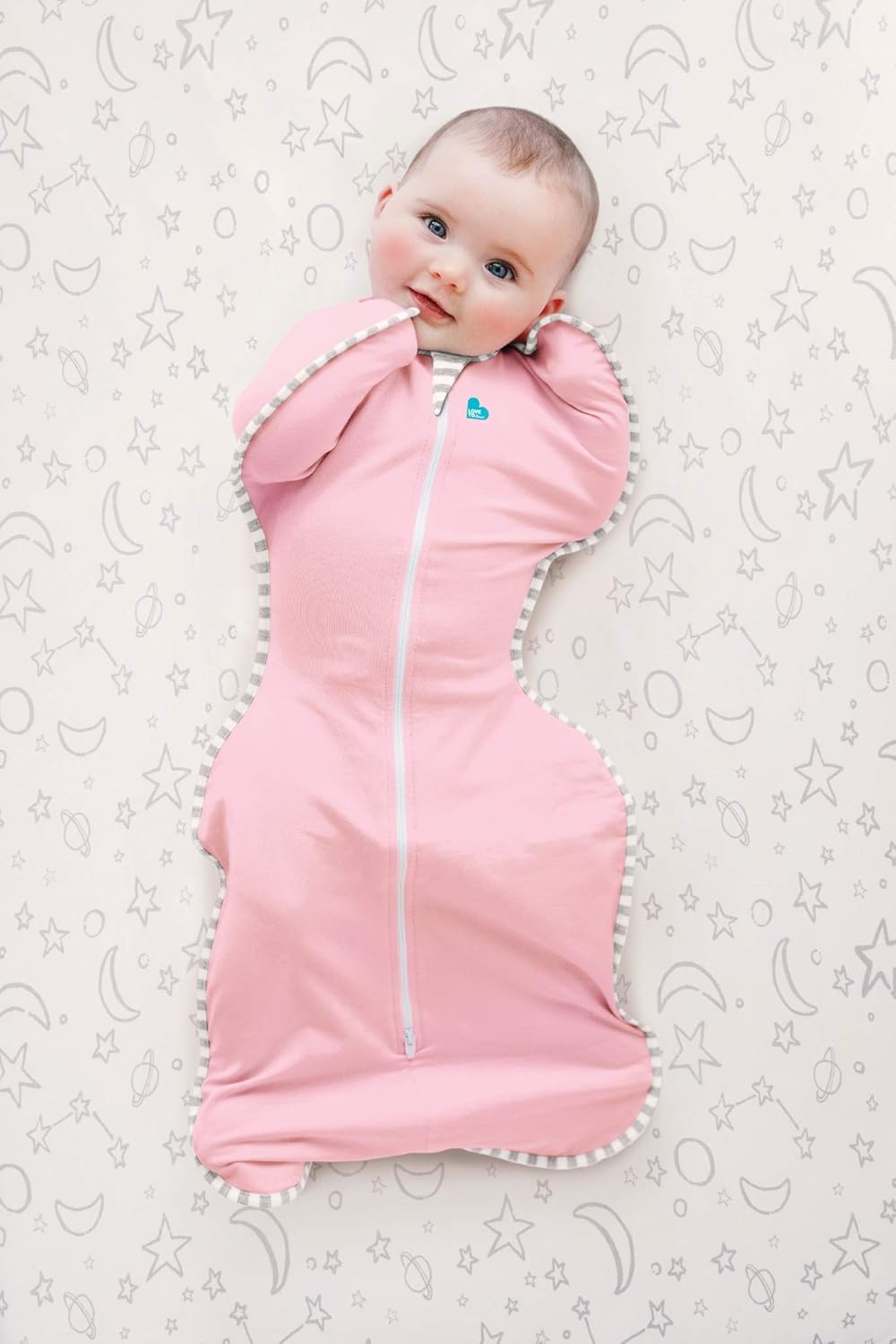 全身を包み込む新生児向けの「ステージ1」と、袖を外したスリーピングバッグ「ステージ2」の2タイプがあるスワドルアップ。新生児向けの「ステージ1」は、手足を上にあげた、赤ちゃんにとって自然な姿勢を保てる形状になっています。
