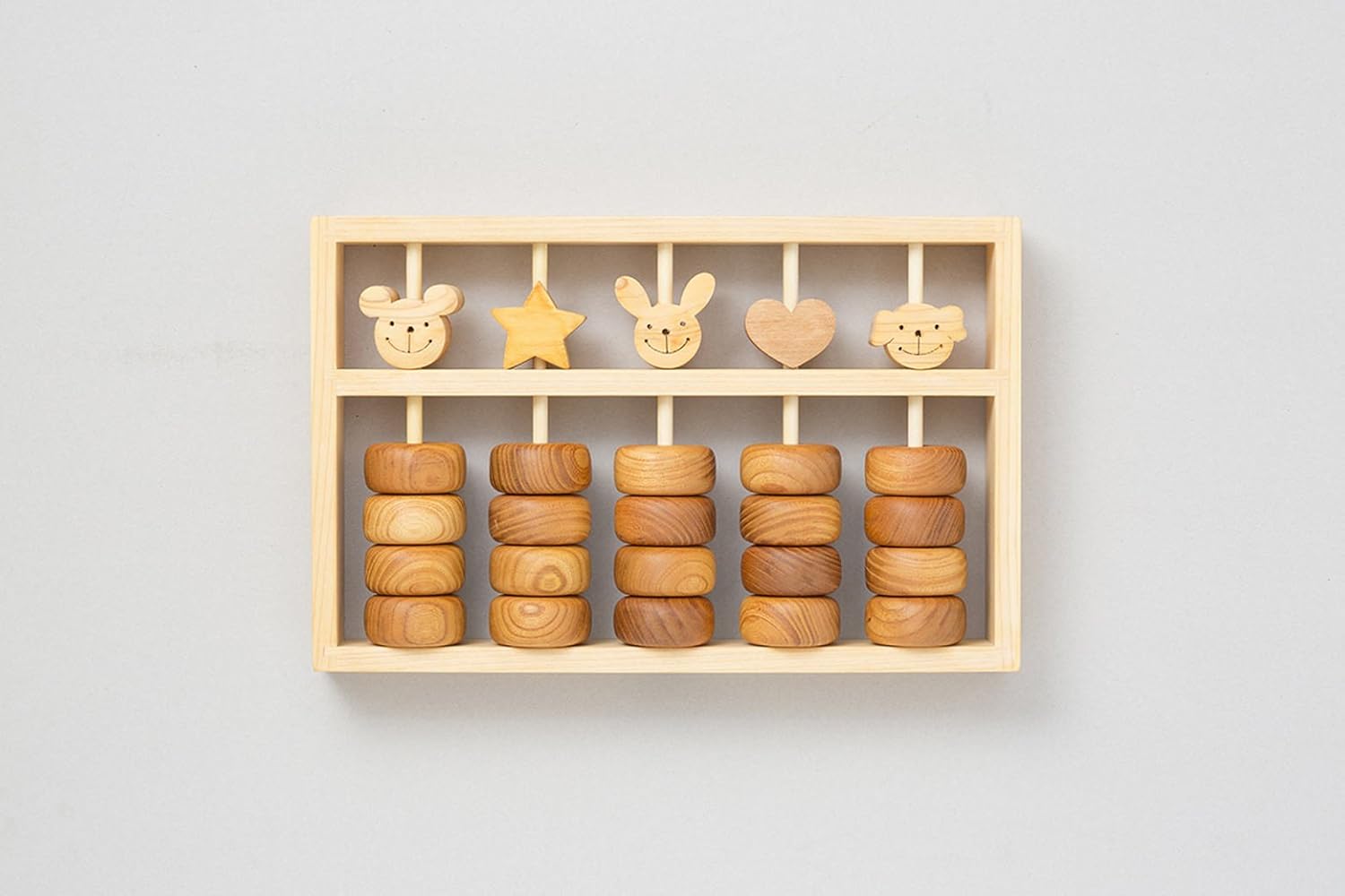 高知県の職人がひとつひとつ心を込めてつくりあげた木製のベビーそろばんは、自然と木のぬくもりが感じられます。赤ちゃんの手にもなじむよう、珠は大きめ。動物や星、ハート形の珠も思わず触れたくなるかわいさですね。