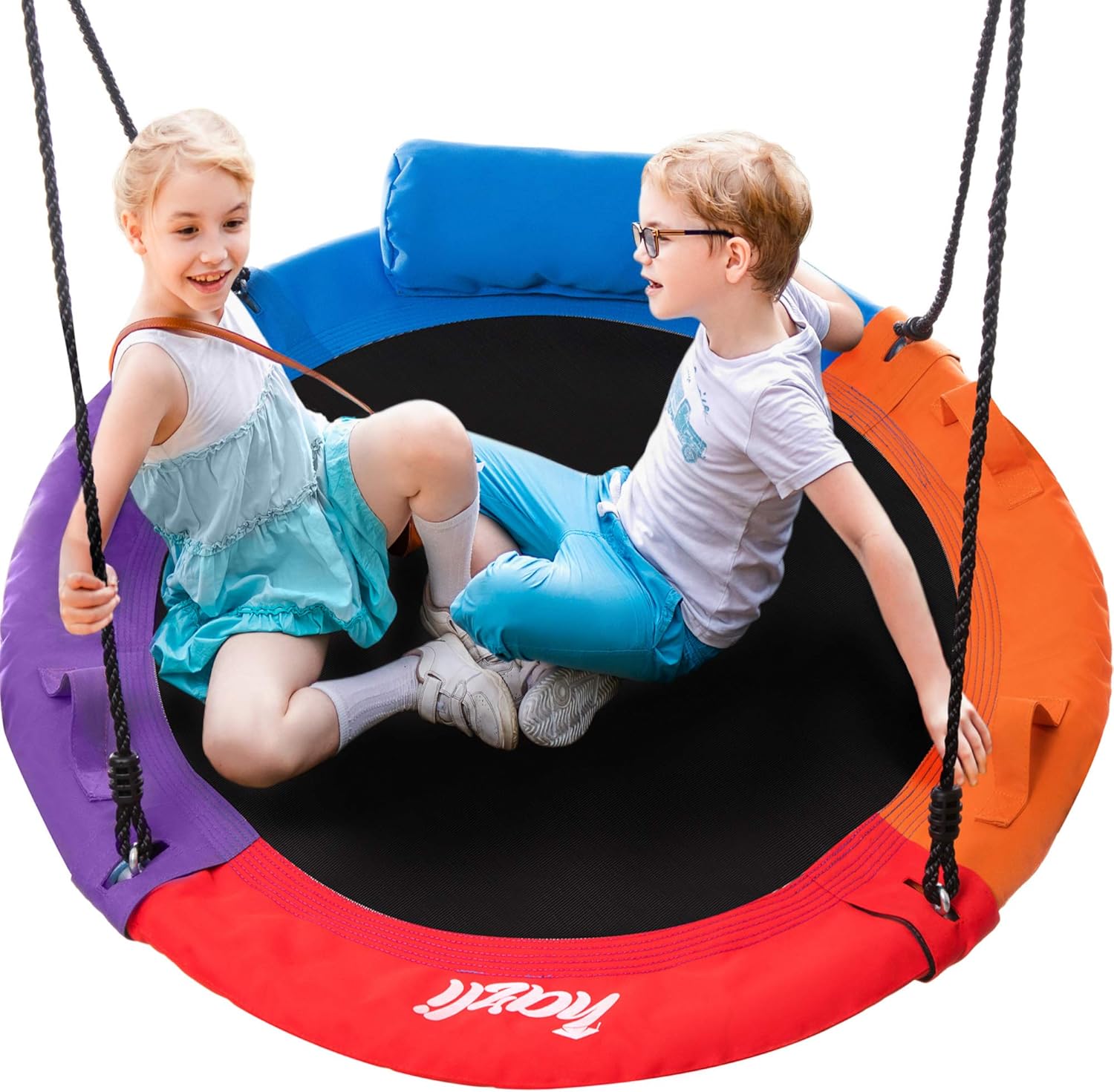 こちらは複数人で乗れる円形型の取り付けタイプのブランコです。極太の吊りストラップに2重ロープと安全面を強化。対重量もたっぷり135kgと、大人も一緒に楽しめるようになっています。ハンモックとしても利用できるよう、枕もついていますよ。庭で遊ぶだけでなく、キャンプなどに持って行っても大活躍しそうですね。