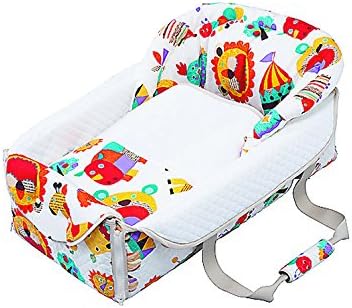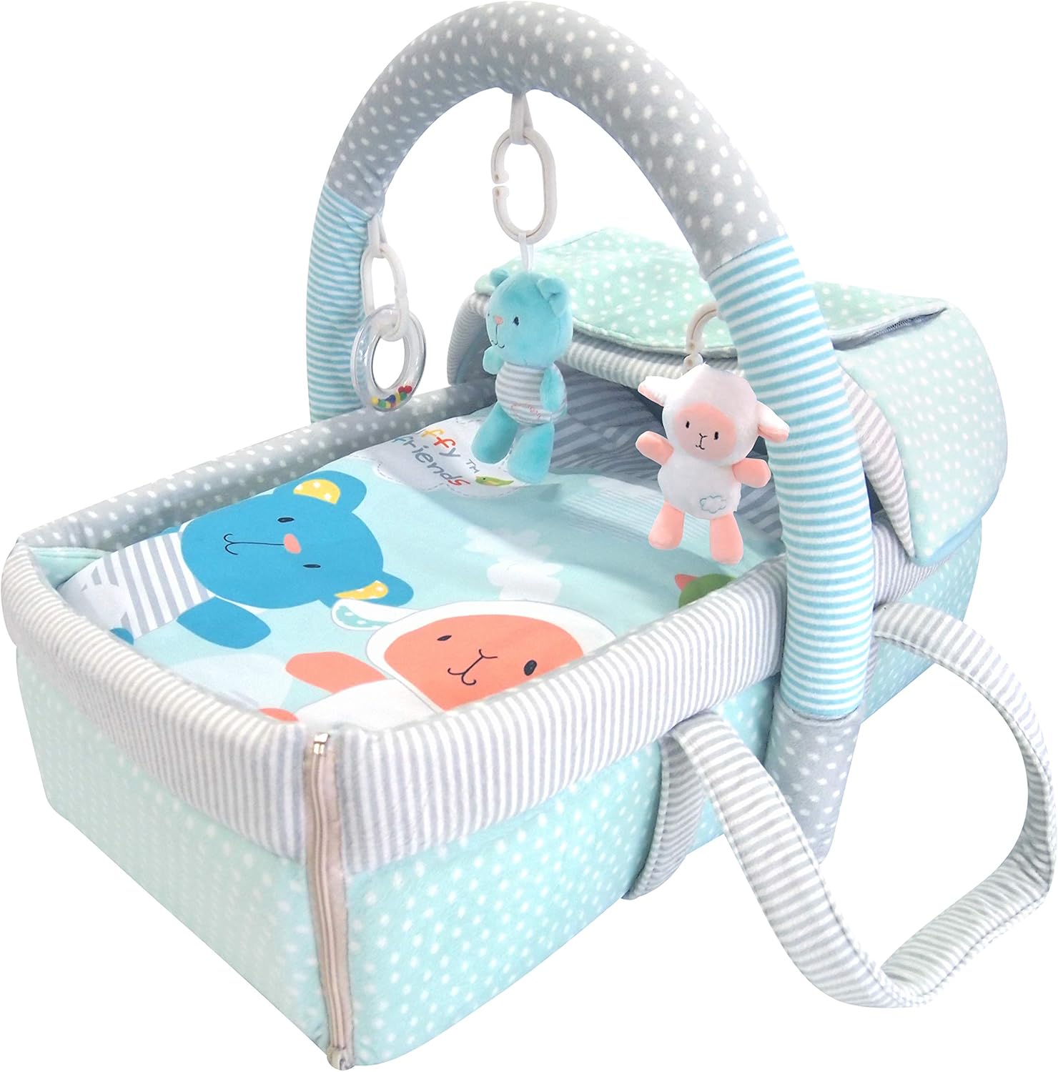 こちらはかわいい動物のぬいぐるみとシャカシャカ音がでるおもちゃのジムメリーが付いたベビーバスケット。なんと枕にも音が鳴るしかけが。赤ちゃんが常にご機嫌でいてくれそうですね。赤ちゃんを固定するベルトも付いているので移動がより安心です。