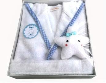 ちょっと成長した赤ちゃん、お子さんへのプレゼントにはこちら。子ども用のガウンタイプバスローブと、キュートな星のぬいぐるみのギフトセットです。よく動くお子さんでもはだけにくい、腰帯付き。厚すぎず着心地のよいバスローブは部屋着にもぴったりです。