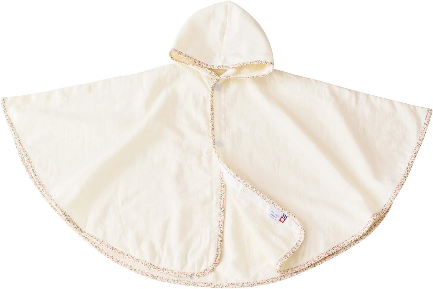 今治で縫製されたガーゼタオルを使用したコットン100%のフード付きバスポンチョです。表面はガーゼ、体に触れる面はパイル地になっています。ふちのパインピングがアクセントになっていて、シンプルな無地のタオルながらもかわいいデザインです。新生児から2歳ごろまで使用できるサイズ。