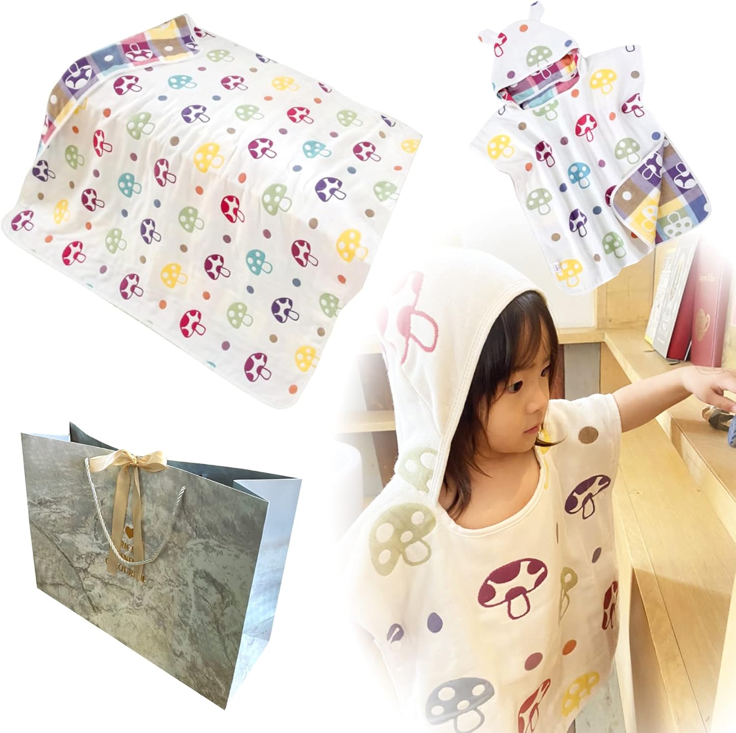 カラフルなきのこ柄がかわいいベストタイプのベビーバスローブ。3か所にスナップボタンがついているので大きく動いてもはだけにくく、スリーパーとしても活躍します。110cm×110cmの大判サイズ。これ1枚で、バスローブ、お昼寝タオル、日よけタオル、授乳ケープとさまざまな使い方ができますよ。