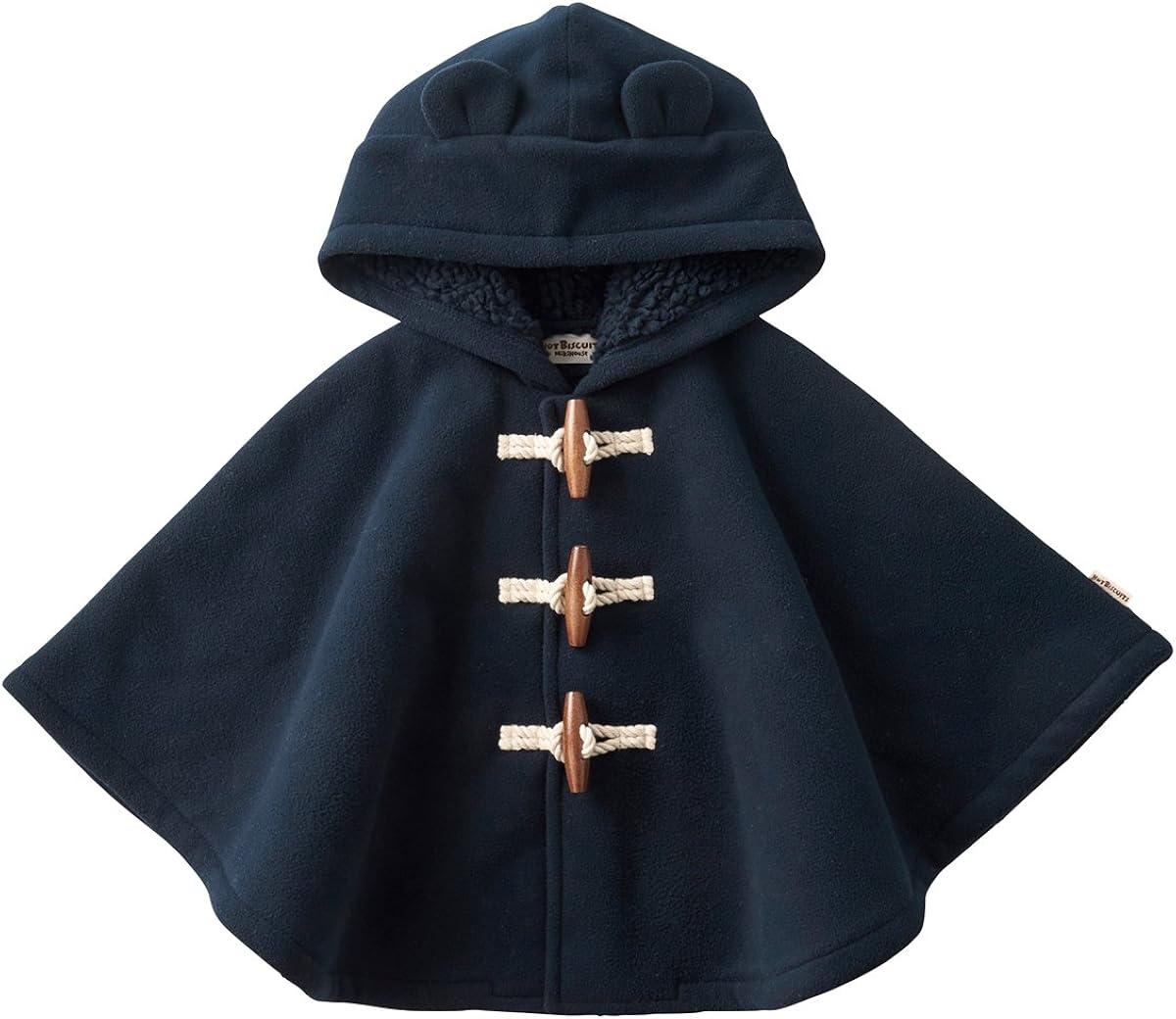 こちらは同じくミキハウスの厚手タイプのベビーポンチョです。裏地に使用されたふわふわのフリースがしっかり保温。寒い日のお出かけに大活躍します。木製のトグルボタンがついたおしゃれなダッフルデザインがかわいいですね。両脇のホックボタンを留めて袖を通すこともできますよ。カラーはネイビーとレッドがあります。