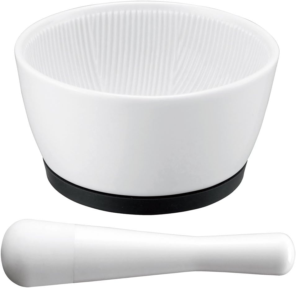 滑り止めのゴムが底面についているシンプルなすり鉢。耐熱ガラスと磁器でできているので、色が濃い野菜を使っても色移りしにくく、また衛生を保ちやすいですね。