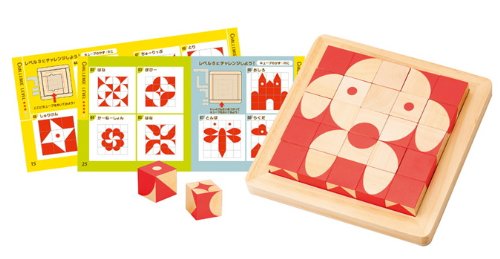 付属のテキストブックを参考に、キューブの模様を組み合わせて絵を描く絵合わせパズルです。初めはキューブ2つを使って、丸や三角などの簡単な図形を作ることからチャレンジ! レベルが上がるごとに、家、チューリップ、ロケットなど、140問もの平面作例と10問の立体作例を作ることができます。作例以外にも、自由に模様や絵柄を作ることができるので、創造力を養うにもぴったりの知育玩具です。