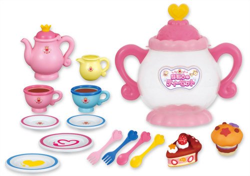 魔法のハケでケーキやドーナツに冷水を塗ると・・・あら不思議! 色が変わって別のスイーツに大変身!ティーカップにはお水を入れただけなのに・・・不思議です。カップの中身に色が付いて、お茶やコーヒーが入ったように。お部屋でもお風呂でもごっこ遊びが楽しめる、可愛くて楽しいティーセットです。