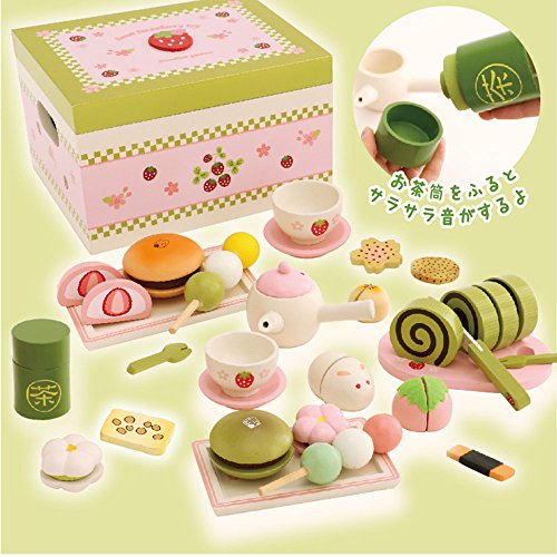 どら焼き、ゴマ煎餅など日本の和菓子や急須、湯呑などお茶のおままごとアイテムが入っているセットです。海外のお友達へのおみやげ、プレゼントとしても大変人気がある商品です。お茶のお作法を子供に教えてあげるのにも重宝します。蓋が外せる収納ボックスには、両サイドに持ち手がついているので、お片づけしやすいのも魅力です。
