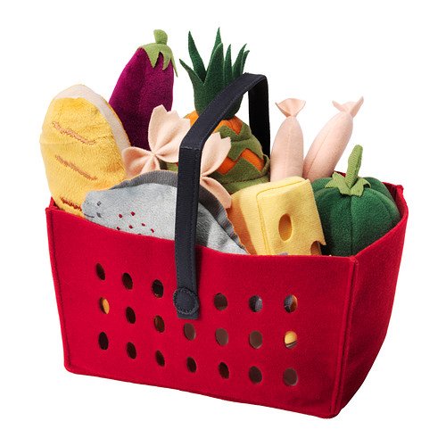 小さな子供はお買い物中、ママの買い物カゴの中をいじりたがりますよね。真っ赤な布製のバスケットの中に、チーズやソーセージ、パスタ、パン、パイナップル、ナス、魚など12個の食材が詰まっています。