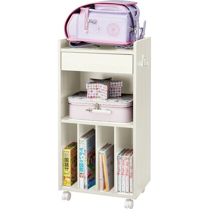 一番上の段にランドセルを置くスペースがあり、ほか引き出しや本棚が付いています。キャスター付きなので、置き場を移動する際も楽チンです!