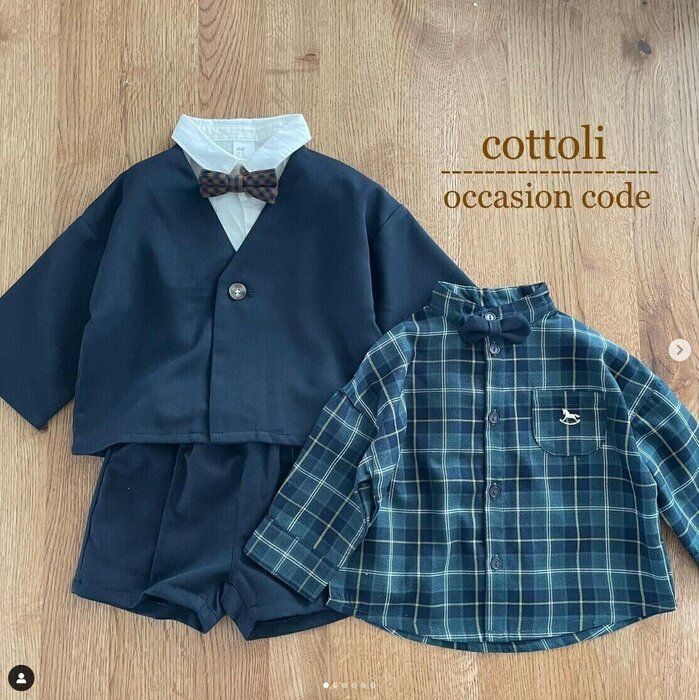 apple.l213さんは、こちらのアイテムを。左の上下セットアップと、右のチェックシャツはバースデイ、白シャツはH&Mで購入したんだそう。チェックシャツの蝶ネクタイには小さいゴムがついており、ボタンにかけられるんだとか。プチプラで買えてよかったとのこと。高見えするフォーマルアイテムですよね。