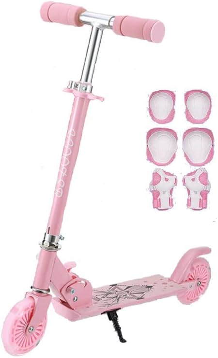 女の子向けの可愛らしいデザインの2輪キックスケーターをお探しならこちらはいかがでしょうか。全体がピンク色で華やか。回転とともにタイヤが鮮やかに光ります。同じくピンクデザインのプロテクターもセットになっていてお得です。