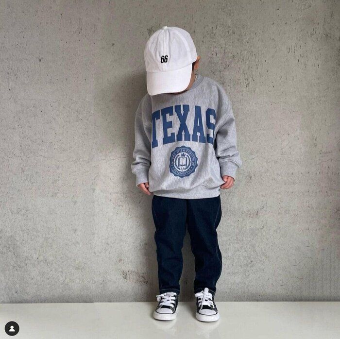 mahoさんはしまむらで買ったキッズトレーナーでコーディネート♪ 毛玉ができにくそうな生地だそうで、特にシルエットがお気に入りだそう!さらにヴィンテージ感のあるデザインも魅力的なポイントとのこと。