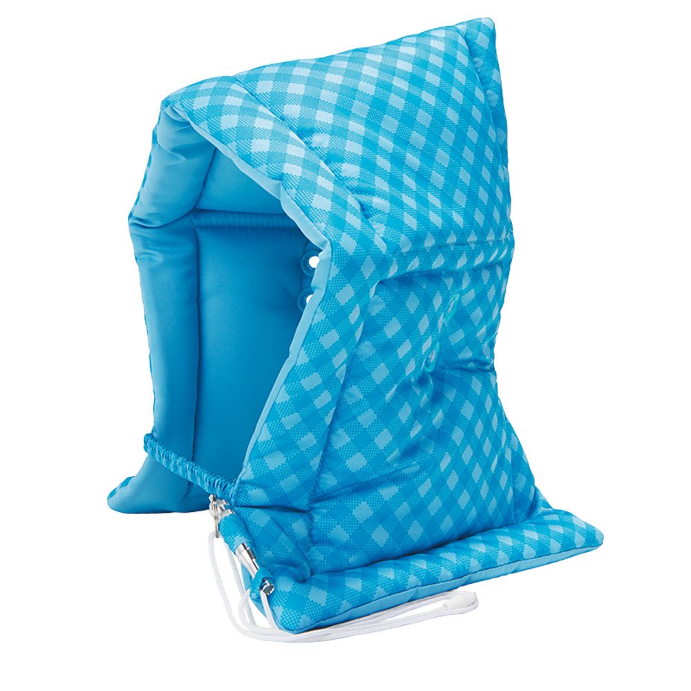 ピンク、ブルー、イエローの3色から選べるタイプ。防災クッションを頭にかぶった時に音がよく聞こえるよう、耳が当たる位置に耳穴があいていて安心・安全です。