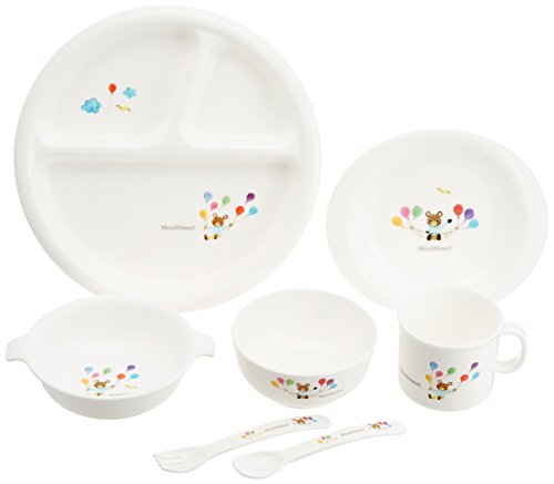 くまと風船のワンポイント柄がキュートなベビー食器セットです。赤ちゃんの食事に必要な食器がほとんど揃っています。また、全ての食器が食洗器対応、スプーンとフォーク以外は電子レンジもOKなのがママにはうれしいですね。出産祝いにもおすすめです。