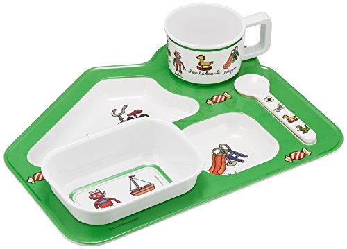 日本国内でも人気のフランス雑貨ショップブランド、La Chaise Longue(ラ シェーズ ロング)のベビー食器です。メラミン製の丈夫な食器に、おもちゃのイラストがほどこされています。写真のグリーンのほか、イエロー、ブルー、ピンク、レッドがあります。
