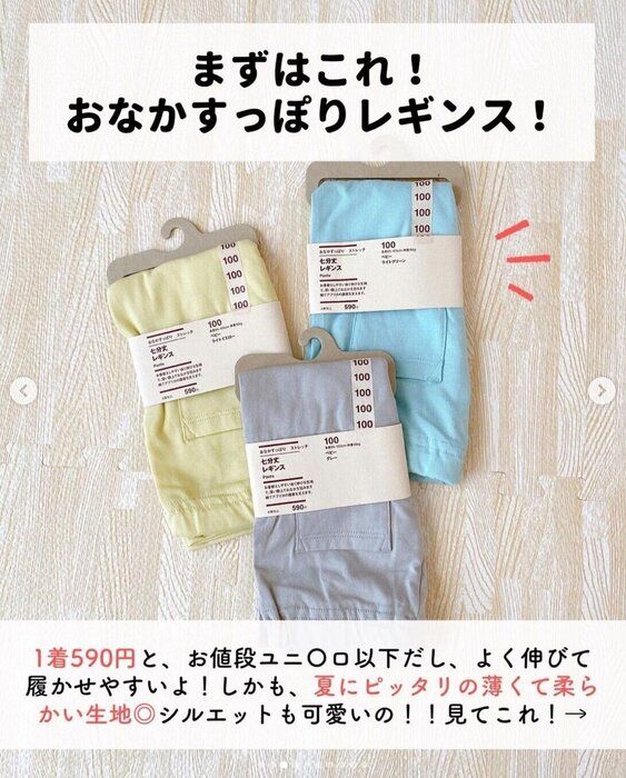kazuyo_mommy25さんは無印良品でレギンスを3色買い!価格はそれぞれ590円で、よく伸びる生地なので子どものおなかまですっぽり収まるのがポイントなんだとか!値段もデザインも履かせやすさも希望通りで、「全て素晴らしくて感動した」とのこと♪