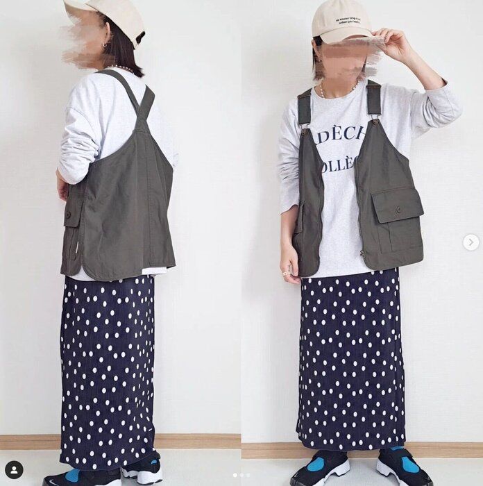 じゅじゅさんはLOGOS DAYS(ロゴス デイズ)のベストでこちらのコーデをセレクト!ベストを羽織るだけで「シンプルなコーデが、一気に旬なコーデに早変わり」とのこと♪ キャップもしまむらで買ったアイテムだそう。