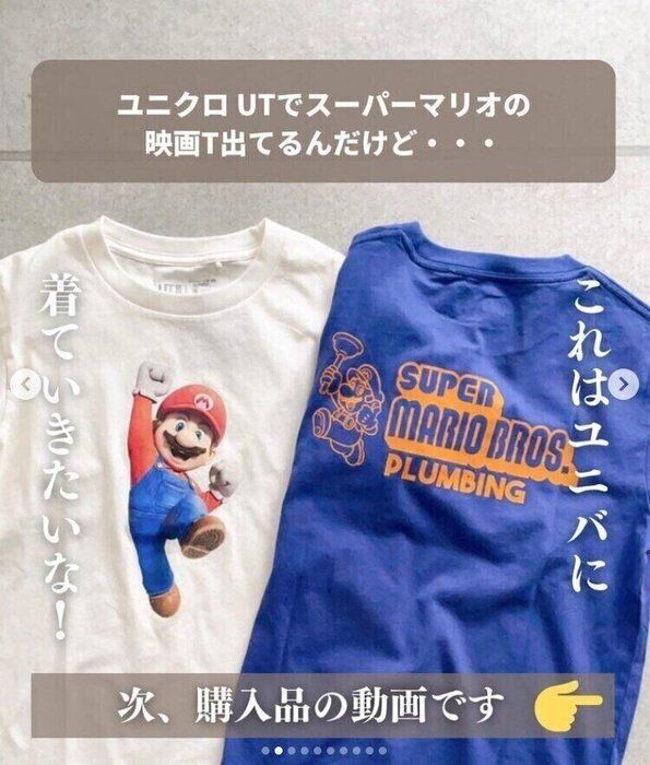 りりんさんは、映画「ザ・スーパーマリオブラザーズ・ムービー」のUTを購入。どのデザインもかわいいけど、親子でお揃いコーデができるデザインとバックプリントが可愛いものをゲットしたんだとか。ブルーのほうは、大人用で同じデザインがあるので親子コーデも◎。コレは買いなアイテムですよね!