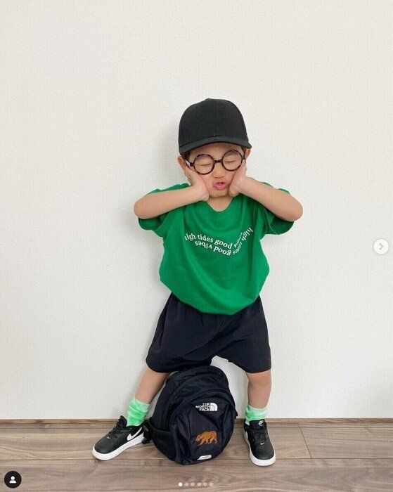 nicopon13さんは、デザインがオシャレなグラフィックTを購入したようですよ。たまたまキッズコーナーを通っていた際、こちらのアイテムが目に入り、即カゴにイン♪ グリーンの色味がツボすぎた!とかなりお気に入りのようですよ。グリーンとブラックで合わせたコーデがとっても素敵ですね。