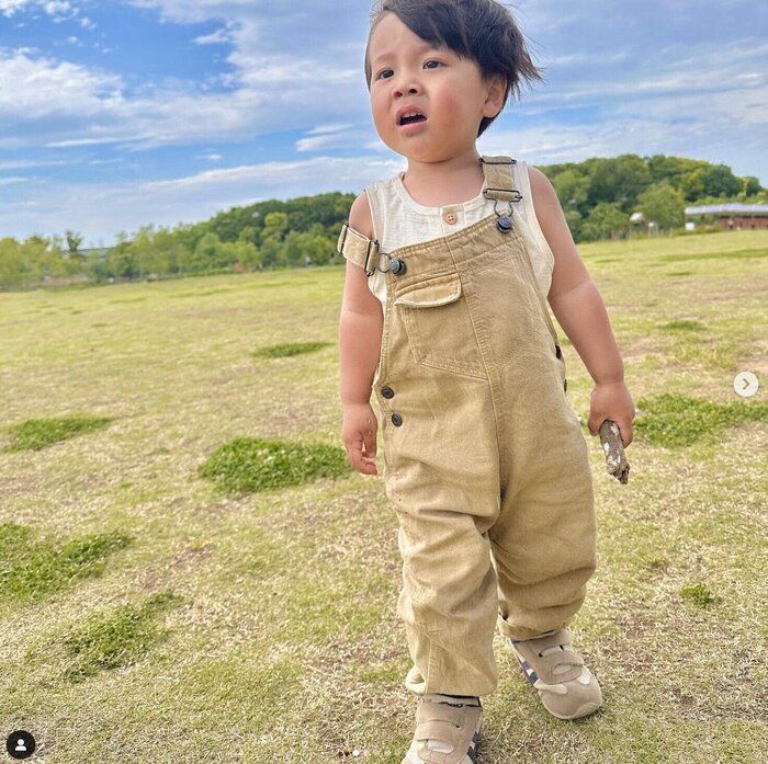mn___mamさんはZARAベビーのデニムサロペットを使ってこちらのコーデをセレクト!ベージュのサロペットにオフホワイトのインナーが可愛らしい色味ですよね♪ こちらの方は、夏だけでなく秋にもこちらのサロペットを着せようと考えているとのこと。