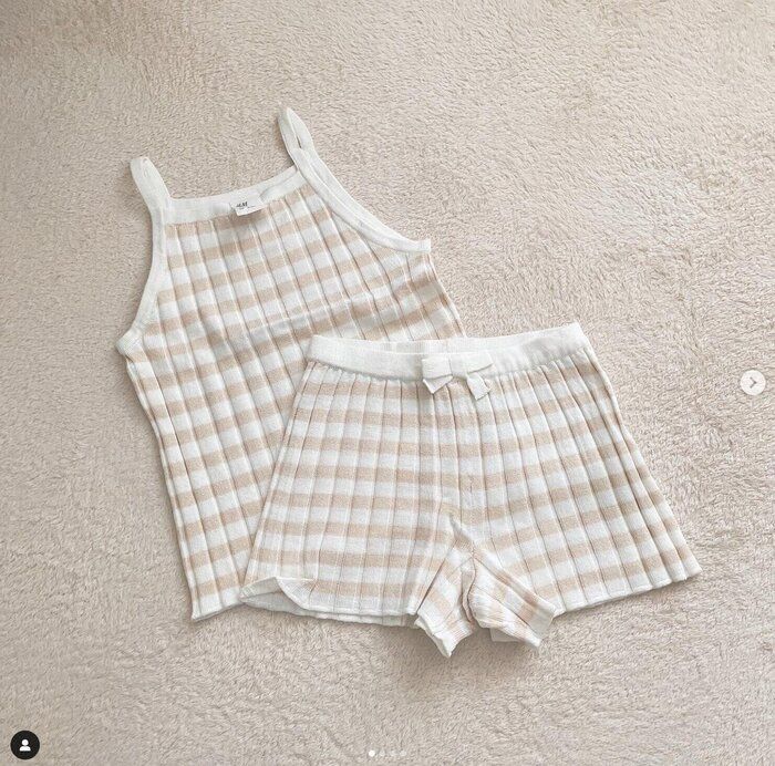 こちらはみーさんのH&Mベビー購入品です。キャミソールとショートパンツのセットアップで、くすみ感のある色味のボーダー柄がとてもおしゃれですよね。ショートパンツのリボンも可愛らしいポイントです♪