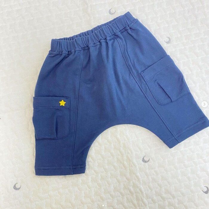 みあきさんは、シナぷしゅとのコラボパンツを購入したようですよ。ほしぞらのような色味のネイビーカラーをゲット♪ ポケットの中を見ると、ぷしゅぷしゅの刺繍がデザインされており、とっても可愛いんだとか。涼しげなハーフパンツですよね。