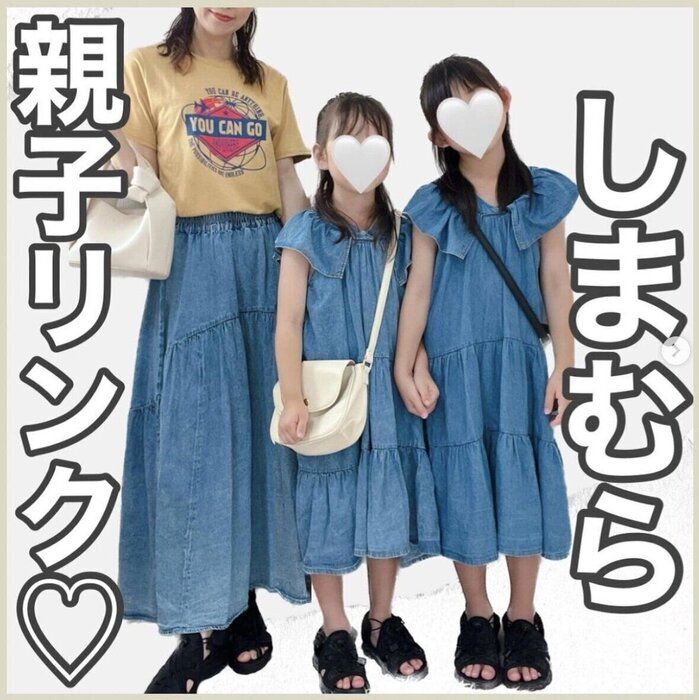 こちらはaiaimama.v.v.vさんが考えた親子リンクコーデ。お子さんのティアードワンピースはしまむらブランド「SEASON REASON by Lin.&Red(シーズン リーズン バイ リン アンド レッド)」の商品で1,419円だったそう。デニムスカートはしまむらブランド「Lax Dan Tia(ラックス ダン ティア)」で2,420円とのこと!