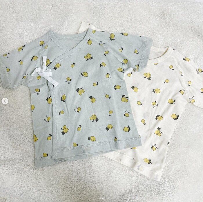 riri_kiki_15さんはこちらの短肌着を西松屋でGET!レモン柄が爽やかな印象で、ホワイトもくすみブルーもおしゃれな色味ですよね。前開きタイプで、胸のあたりのリボンで留められるようになっていますね。