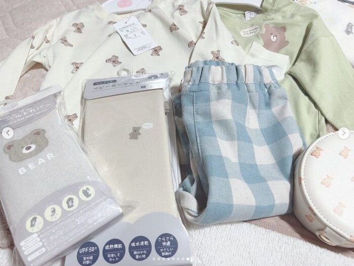 こちらは、くまさんモチーフのアイテムが好きだというknmelody0924さんの西松屋購入品。ロンTやボトムスといったベビー服はもちろん、ベルトカバーやベビーカーケットといったお世話グッズも買ったんだとか♪