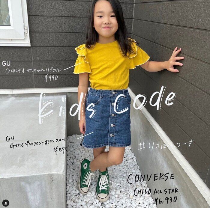 Risaさんは「オープンショルダーリブフリルT」と「デニムフロントボタンスカート」を購入。GUのお洋服が好みのようで、お気に入りのようですよ♪ 秋らしい色味のイエローとグリーンのシューズ、デニムスカートとの組み合わせがとってもオシャレで素敵!お値段が比較的お安いのもうれしいですね。