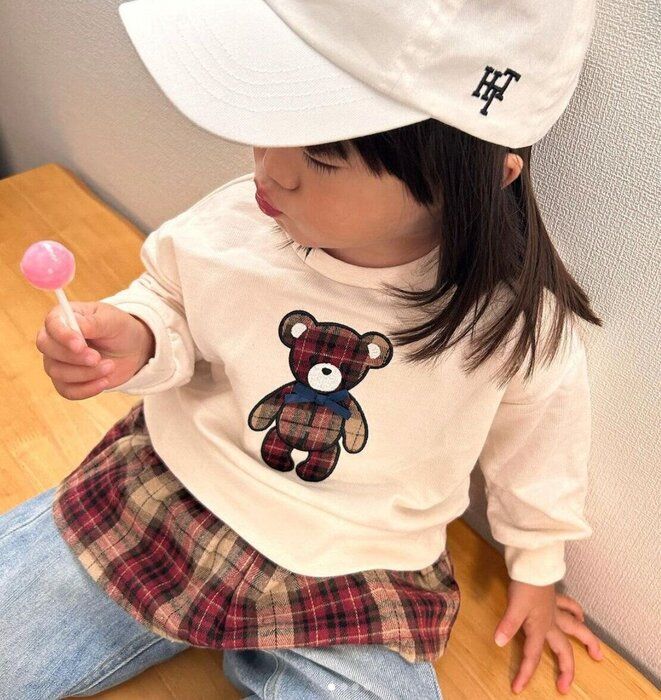 こちらは、西松屋のくま柄トレーナー。レイヤード風のデザインになっているので、これ1枚だけで、おしゃれなコーデが完成しますね!to7426yuさんは、デニムパンツとキャップを合わせて、ガーリーカジュアルに仕上げたんだそう♪