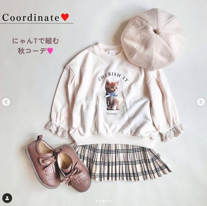 こちらはバースデイで販売されている、裏毛トレーナー。ねこのプリントはもちろん、そでのフリルがとてもかわいいですよね!michu__71さんは、チェックスカートやベレー帽を合わせて、秋のガーリーコーデに仕上げたそう♪