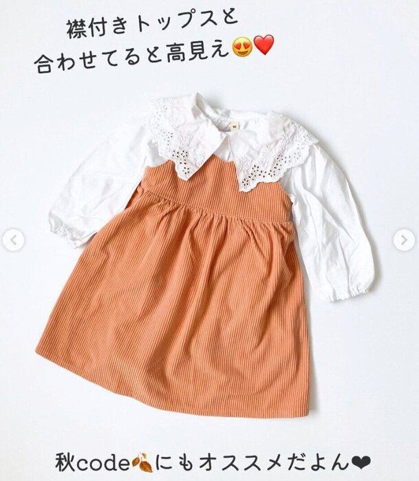 こちらは秋コーデに欠かせない、ジャンパースカート。えり付きのトップスと合わせると、高見えコーデに仕上がるんだとか♪ インナーを変えるだけで違う印象になるので、いろいろなコーデを楽しめそうですね!