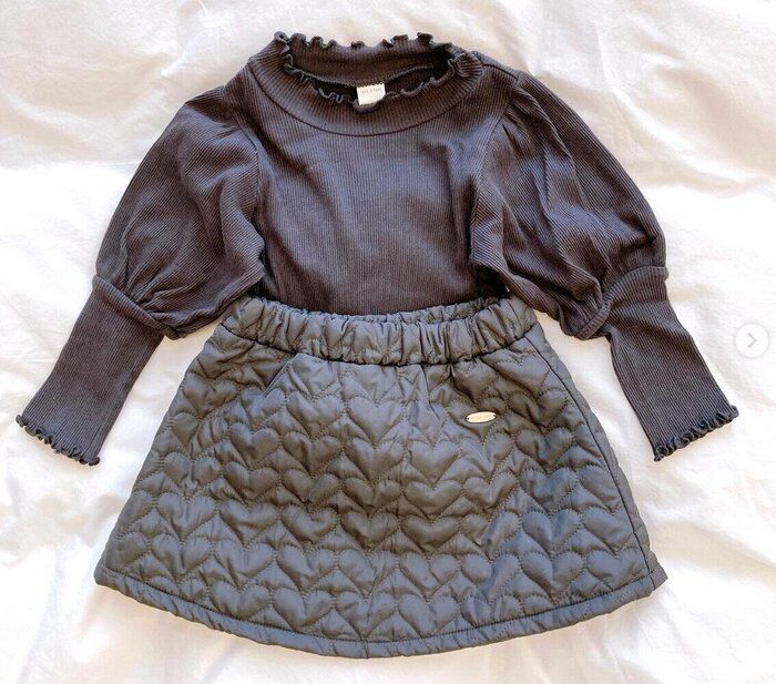 こちらは、大人気のハート柄キルティングスカート。mami_mr4379さんは、黒のトップスを合わせて、大人っぽコーデに仕上げたようです♪ 今季は大人もハート柄キルティングがトレンドなので、リンクコーデもできそうですね!