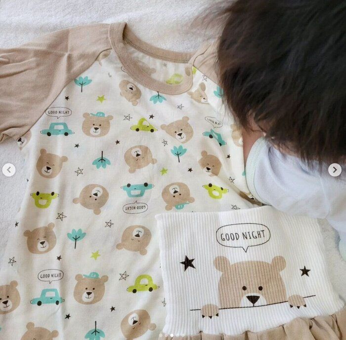 お子さんのパジャマデビューにと選んだのは、くまのイラストがかわいい、腹巻き付きのパジャマ。腹巻きの部分はよく伸びるため、おなかも苦しくならないんだそう♪ 薄手の長袖なので、寒暖差がある時期にも使いやすいですね!