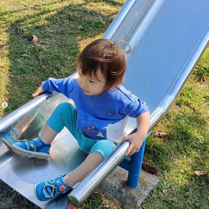 あさひのママさんは、シナぷしゅコラボのカンタンTを着せて、近所の公園へ♪ ほどよいゆったり感で、動きやすそうですよね。まさに公園遊びなど、アクティブな動きにもバッチリ!レギンス・靴もブルーで合わせており、爽やかな印象ですよね。