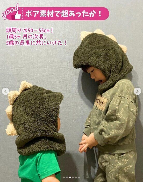 こちらyuri_mama.kosodateさんがキャンドゥで購入した「キッズフードウォーマー 恐竜」。ボア素材でとってもあったかいとのことで、寒い日のお出かけに重宝しそうですね♪ 440円商品のようですが、「とにかく可愛い」と大満足の様子。適応サイズは頭周り50~55cmとのこと。
