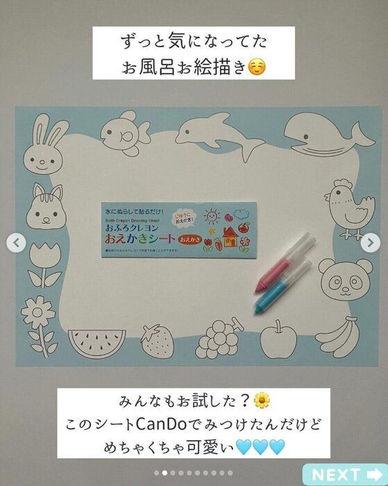 こちらはsukai_100_girlさんがずっと気になってたというキャンドゥの「おふろクレヨン おえかきシート」。お絵かき用のシートと水で消せるクレヨンがセットになっているアイテムのようです。お子さんはシートに描かれたイラストに色を塗ったりして楽しんでいるんだとか♪「お風呂嫌いの子も試してみる価値あり」とのこと。