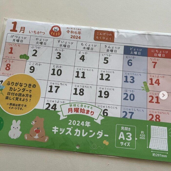 こちらはkamama0619さんがキャンドゥでゲットした「カレンダー2024 壁掛け キッズ」。曜日や日付の読み方を学べるように、ふりがなが付いているカレンダーなんだとか。最後のページには十二支や祝日の簡単な説明も書いてあるようです◎