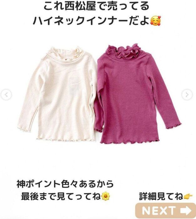 こちらは、西松屋の10分丈スパッツ。カラーネップのデザインがSNSでも大人気で、kumama2638さんはリピ3足目なんだとか♪ スパッツは着まわし力の高いアイテムなので、ゲットしておきたいですね!