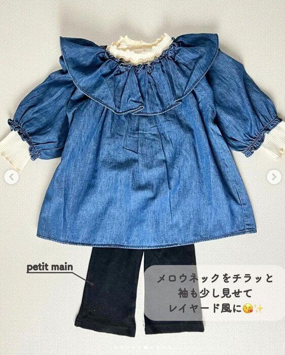 こちらはビッグカラーが印象的な、7分丈デニムフリルブラウス。1枚で着るのはもちろん、この投稿のようなレイヤードコーデも素敵ですよね♪ 首もとはゴム仕様になっていて、子どもでも着脱しやすいんだとか◎