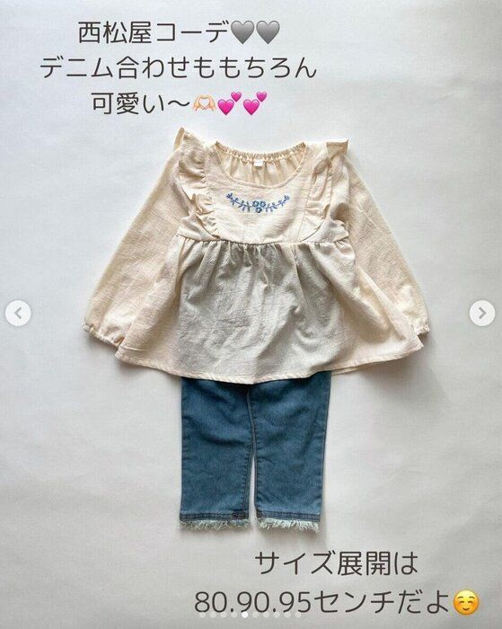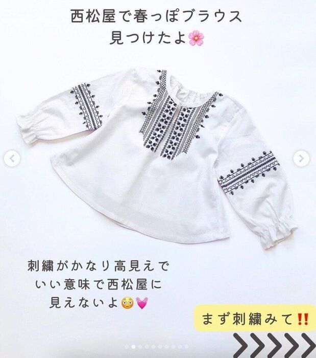 こちらは、西松屋のツイルブラウス。そでがフレアになっていたり、こまやかな刺しゅうが入っていたりと、かなり高見えするアイテムなんだとか!rin_sisters.7さんは、デニムパンツや花柄パンツを合わせて、春コーデを楽しむんだそうです♪