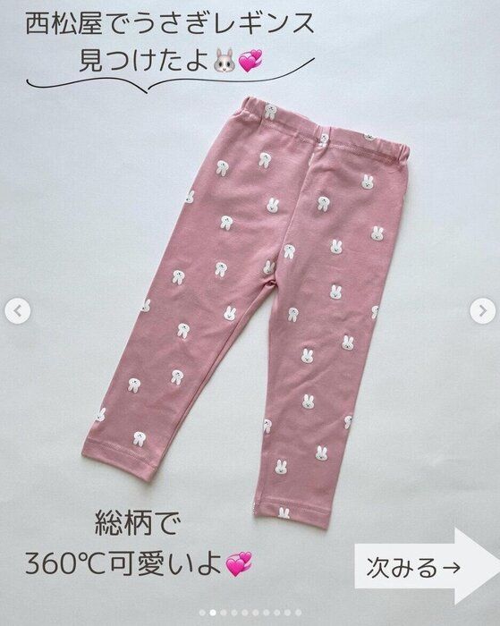 kumama2638さんが「コスパ最強」とおすすめするのは、438円で販売されている、うさぎ柄レギンス。総柄なので、360度どこから見てもかわいいんだとか♪ ストレッチ性があり、はかせやすいとのことなので、保育園着としても活躍しそうですよね◎