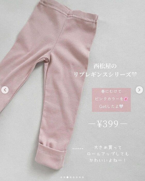レギンスを求めて西松屋へ行ったというchiiiさんが購入したのは、こちらのリブレギンス。春に向けて、ピンクカラーのレギンスを購入したんだそう♪ 438円とプチプラ価格なので、公園着などにもおすすめとのこと!
