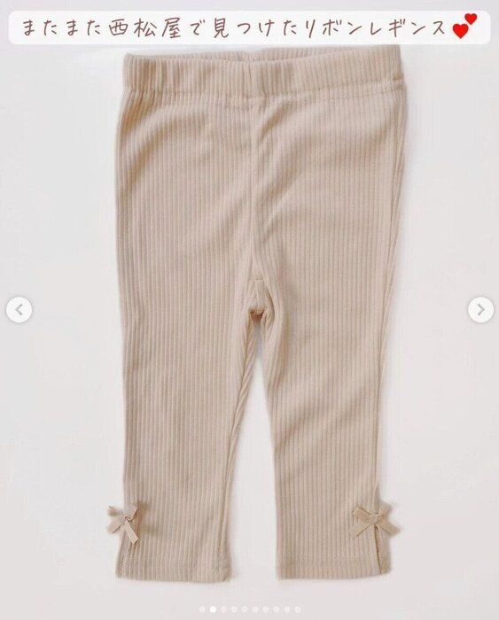 こちらはpiyo.piyo__chanさんが「絶対買ってほしい」とおすすめする、西松屋の7分丈レギンス。すそのリボンとスリットがかわいいのはもちろんのこと、やわらかくて着せやすいんだとか♪ ベーシックな色味なので、手持ちのアイテムとも合わせやすそうですね!こちらは658円で販売されているとのこと。