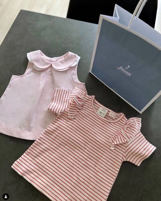 Hinanoさんは、春夏に向けて娘さんのお洋服をゲット。手前側にあるボーダーのTシャツがZARAのアイテムで、夏らしいデザインですよね!細めのボーダーにポップな赤色、肩部分にフリフリがついているのもGood♪ この夏のヘビロテアイテムになりそうですね。