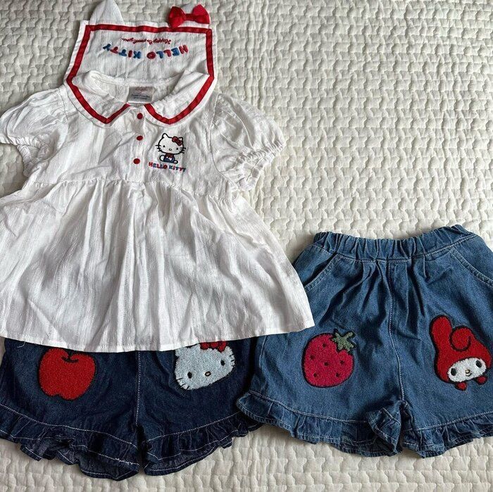 こちらはpan.oyuzurareさんがゲットした、ブラウスとデニムのショートパンツ。ブラウスのえりの後ろ側についている、立体的なリボンと耳がとてもかわいいですよね♪ デニムのショートパンツは、すそのフリルや立体的な刺しゅうデザインが印象的で、子どもウケがよさそう!