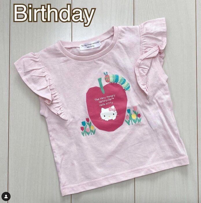 ハローキティが大好きだというお子さんのために、すみーさんがゲットしたのは、こちらの半袖Tシャツ。ハローキティと、はらぺこあおむしのコラボデザインがとてもかわいいですよね!そでぐちもフリルになっていて、キッズが大喜びしそう♪